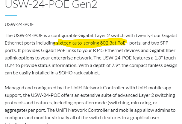 Btw the usw 24 poe is a configurable gigabit layer 2 switch with twenty four gigabit ethernet ports including sixteen auto sensing 802 3at poe ports and two sfp ports.